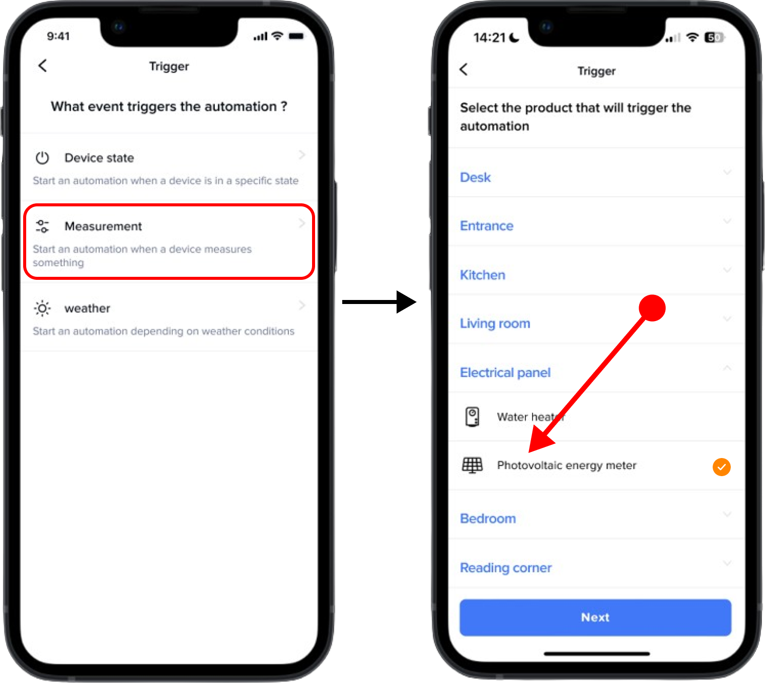 After selecting "Grid injection", the automation will be launched when the power injected into the grid is over or under the selected value. Once this threshold is reached, the automation you have defined is triggered regardless of the device you decide to turn on.