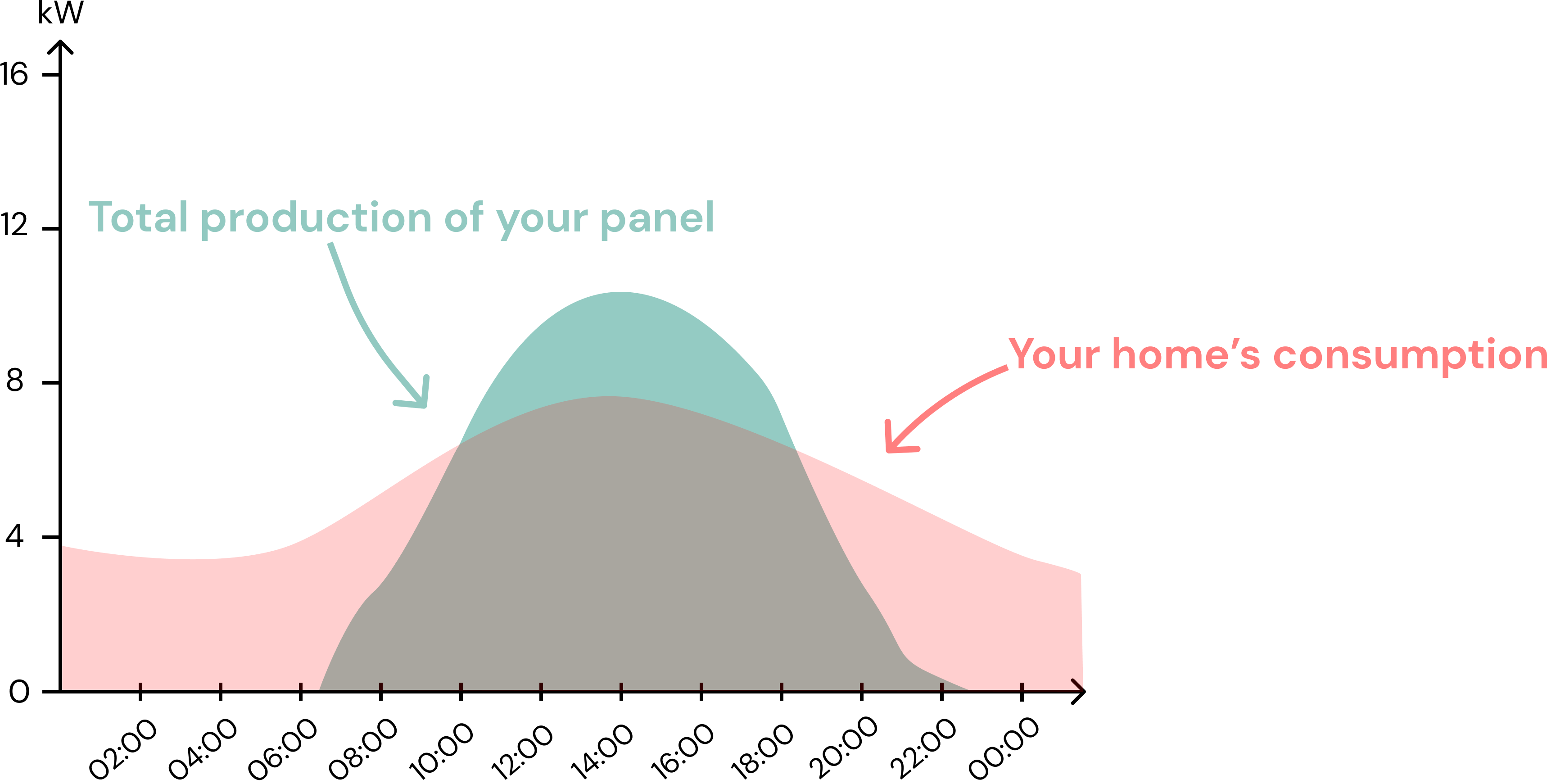 "Grid Injection" is the surplus power produced by your solar panels that is not consumed by your home and is therefore fed into the grid. It represents the excess solar energy available after meeting your home’s power needs. On the graph, the grid injection represents only the part above the home consumption.