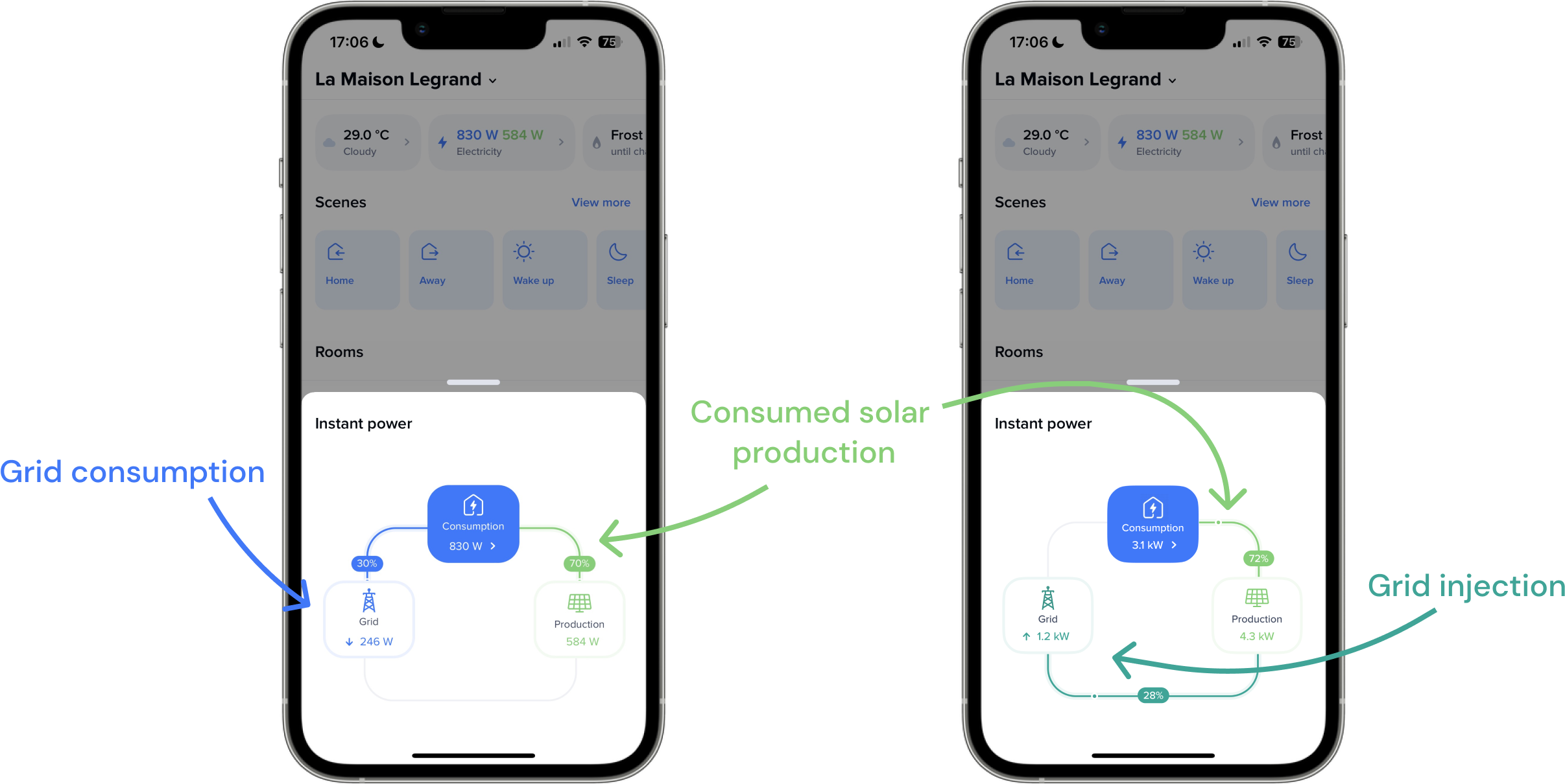 You can view your total production, grid-related information, and your total consumption from the Home + Control app dashboard. Simply click the pill at the top left of the screen to access these details. You will see your home consumption, your total production and know if you are consuming from the network or injecting into it.