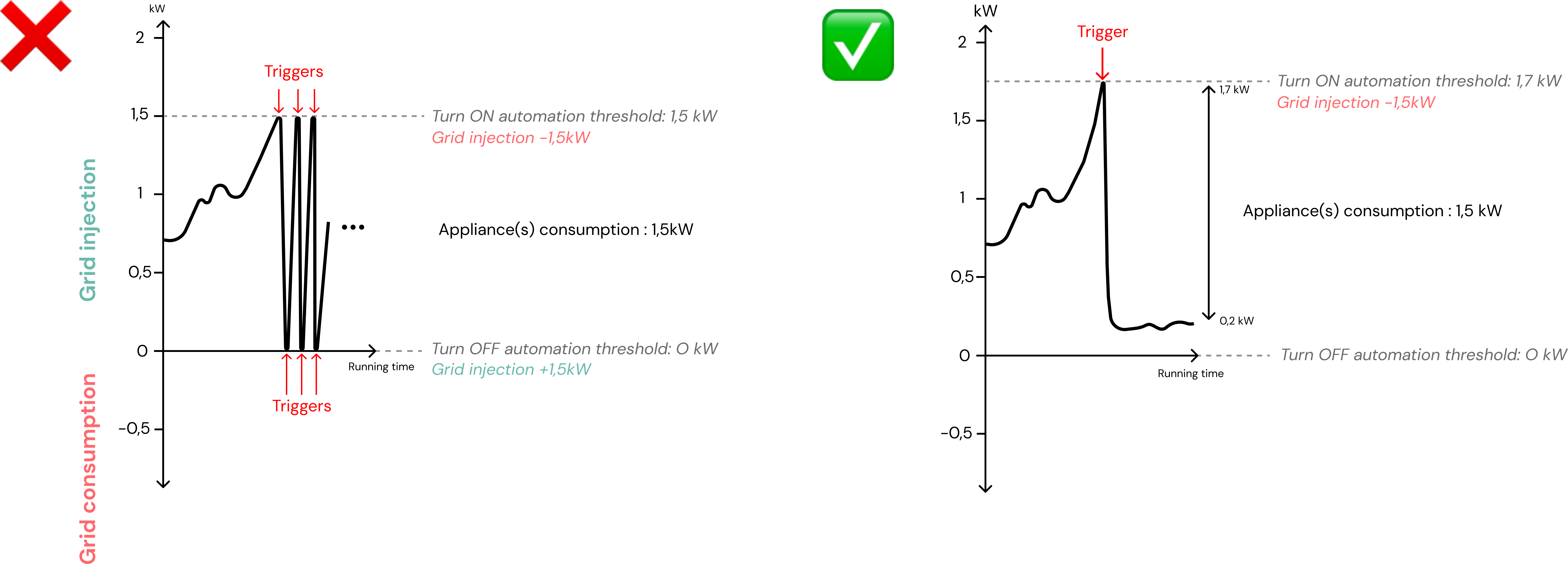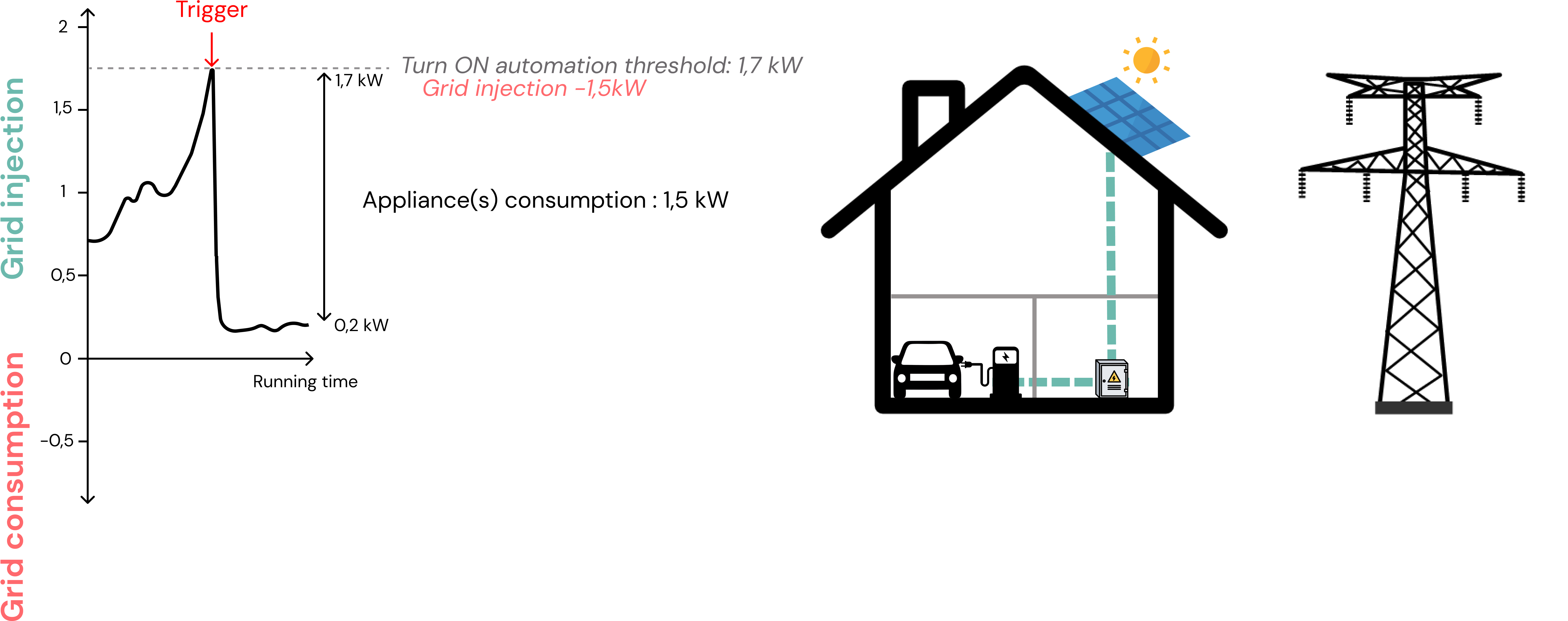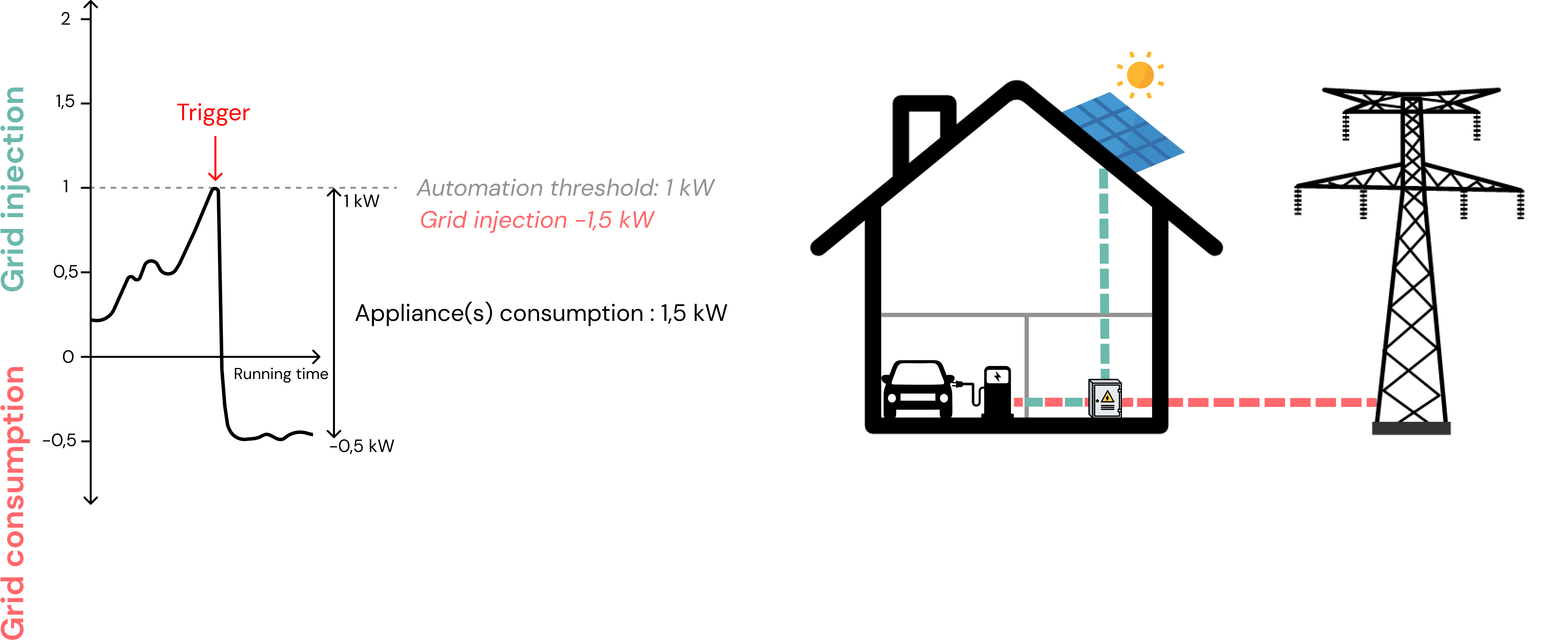 Before setting your turn-on threshold, it's crucial to know the instantaneous consumption of the appliances you plan to activate. The principle is that the trigger threshold corresponds to the consumption of the appliance(s) to be switched on. For example, if you're automating a 1,5 kW water heater, make sure the grid injection threshold reflects this consumption. If the turn-on threshold is too low, when the appliance will turn on, you will instantly consume from the grid.