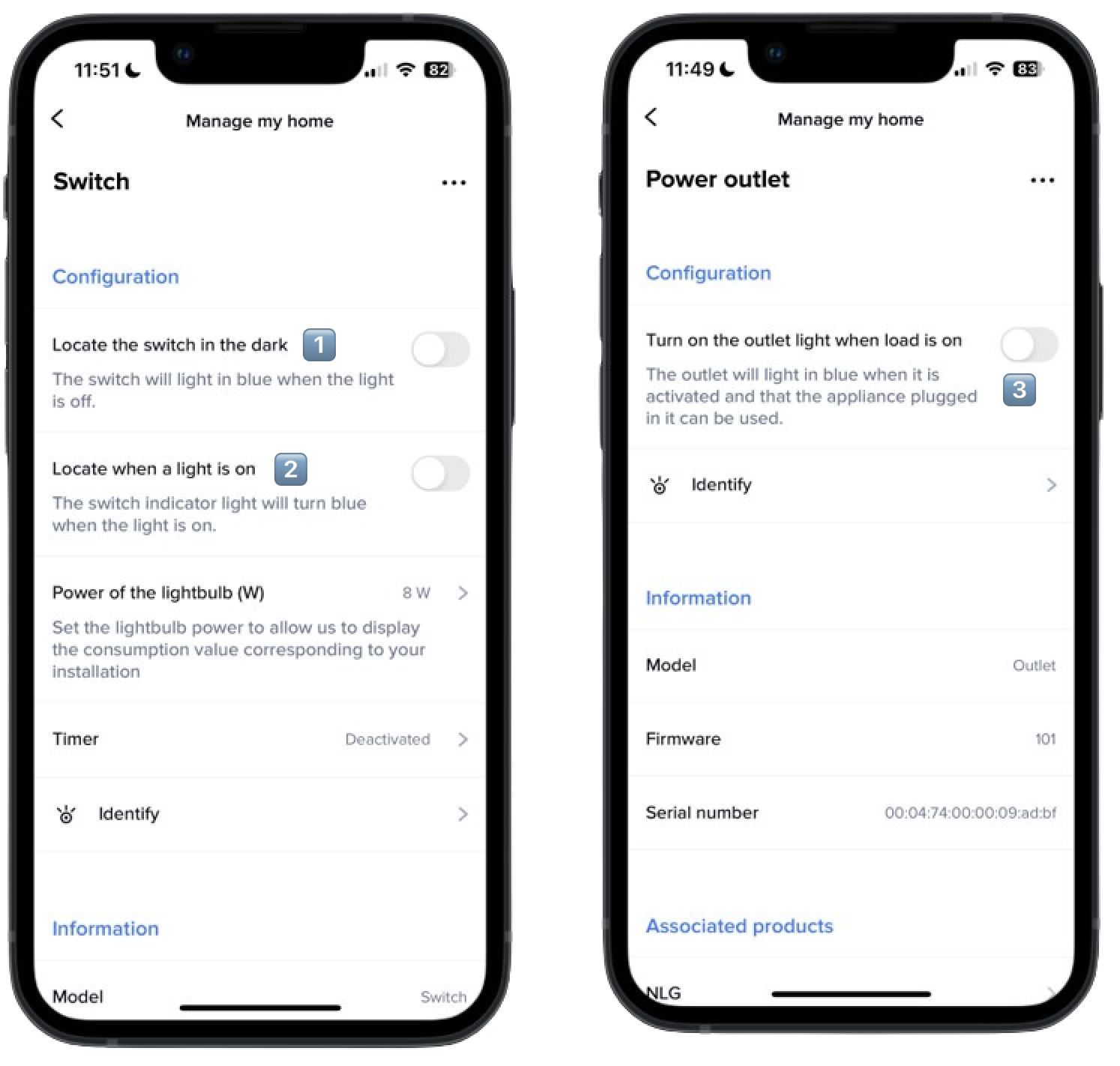 - Choisissez l'interrupteur où vous souhaitez activer/désactiver l'option "Repérer facilement cet interrupteur dans le noir" 1️⃣ et l'option "Repérer quand une lumière est allumée". 2️⃣