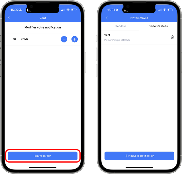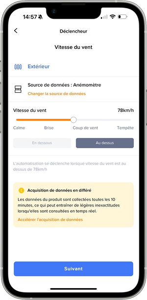 Si vous souhaiter accélérer l'acquisition des données et déclencher vos automatisations plus rapidement lors de certaines conditions précises (vitesse du vent, niveau sonore, niveau de précipitation), vous pouvez créer une notification dans l'application Netatmo Weather.