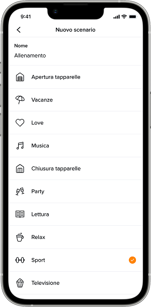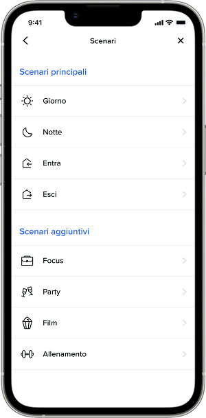 Uno scenario è un insieme specifico di azioni dell'impianto, come uno stato definito di luci, tapparelle, termostato e impianto audio, che l'utente può richiamare manualmente tramite comando locale, sullo smartphone tramite l'app Home + Control o anche con l'assistenza vocale, se integrata nell'impianto.